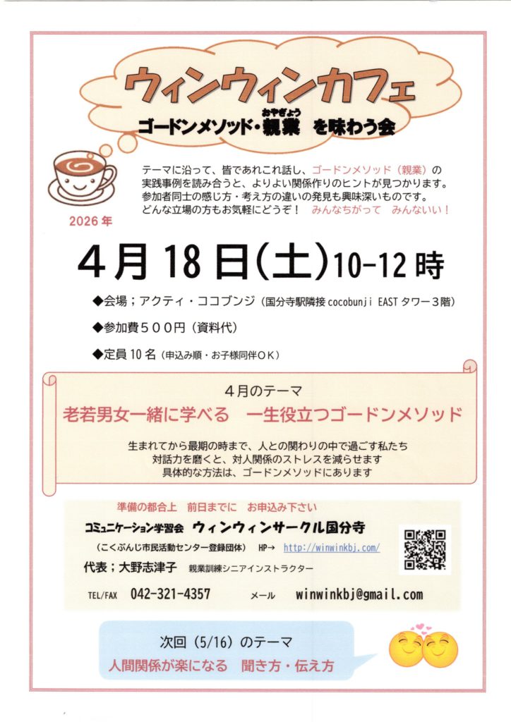 市民活動団体からのお知らせ, 表示 コミュニケーション学習会ウィンウインサークルからのお知らせ コミュニケーション学習会ウィンウインサークルからのお知らせ 2026.04.2 市民活動団体からのお知らせ、表示